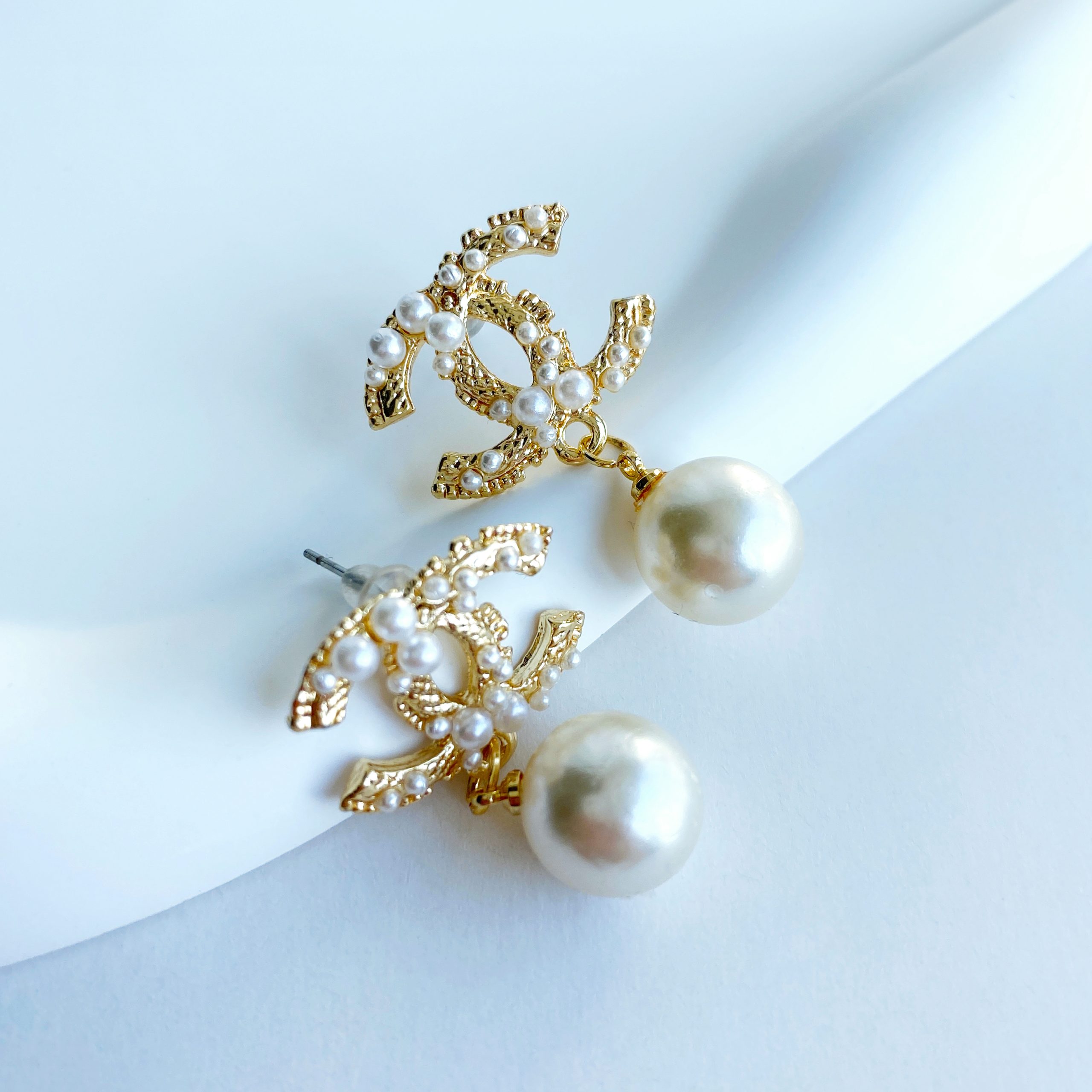 Chanel inci küpemiz, küçük inci ayrıntılarıyla şık kombinlerinizi tamamlar.